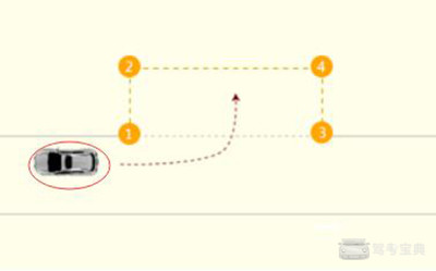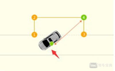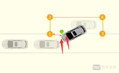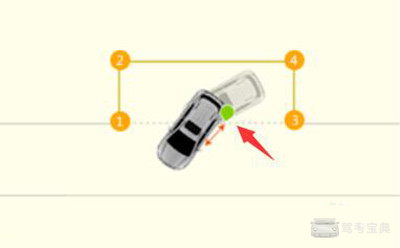 3、然后看左边后视镜,看到车库后面右边的角。如下图4号点位置。这时把方向盘回正倒车。